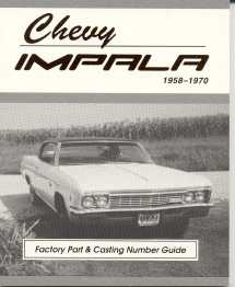 Chevy Impala - 1958 to 1970 Your comprehensive guide to ID Impalas. Covers casting numbers, suffix codes, transmission codes, rear axle codes, part numbers, production counts and more. If you LOVE Impalas, this is your guide. Whether you own one or are looking to buy one, all the numbers and codes you need to ID Casting Numbers, Suffix Codes, Transmission Codes and Rear Axle Codes to verify a Numbers Matching car are here. Dimensions: Pocket Size (4in x 5in) Pages: 96 This price includes FREE shipping to the lower US 48 states. Additional Information This is the low-down you're looking for on Impalas. Know your stuff and get it right the first time. Knowledge is power - buying or selling! This book was made to take in your pocket as you shop for Impalas and Impala parts. That way you will know whether to buy or keep looking. Remember, no one wants to buy a Numbers Matching Impala SS 427/425 only to find out later it is a cloned 6 cylinder car after the deal was made. Covers YEARS, CASTING NUMBERS and CODES: - YEARS - Impala's from 1958 - 1970.